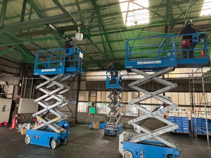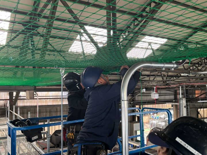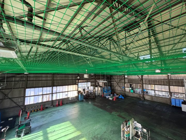 今回の事例では、お客様より「建屋内へ鳥が侵入してしまい、糞による製品や設備への被害、衛生環境の悪化に困っている…」とご相談いただきました。そこで、当社にて防鳥ネットの設置工事をご提案!現地の状況や寸法に合わせて最適なネットを設計し、作業や換気の妨げにならないよう施工しました。